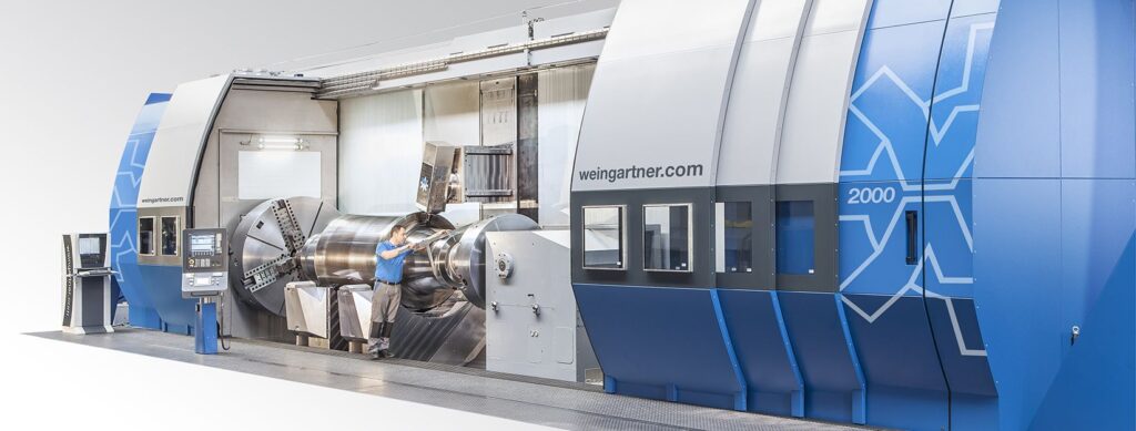 During the project phase and given the client’s large range of parts, it quickly became clear that the new Weingärtner flagship mpmc 2000 would be needed. This extraordinary piece of Austrian engineering features as already given in the designation, a maximum turning diameter of 2000 mm. The huge dimensions are complimented by the maximum workpiece load capacity between chuck and tailstock of 60,000 kg. This is equivalent to a fully loaded freight car. The special developed and in-house produced “Weingärtner steady rests”, enable the machining center to bear the full workpiece load even without the support of the tailstock. This characteristic is necessary to make face turning run just like all other boring and internal machining operations.